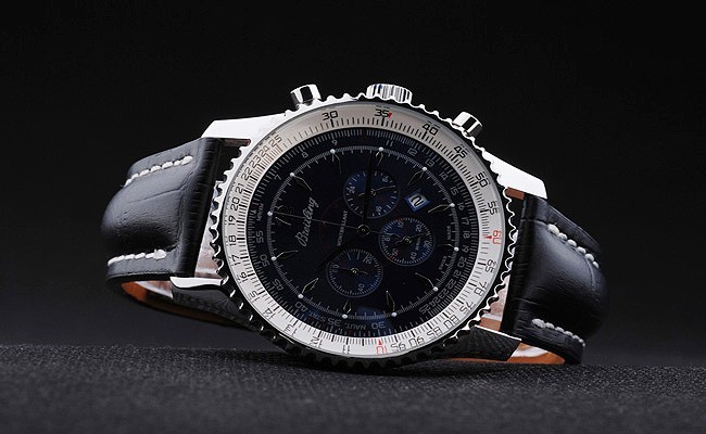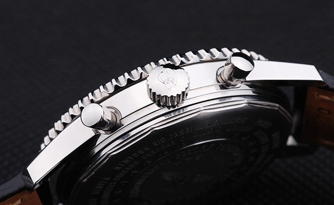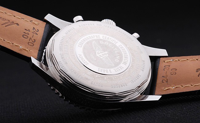Bracelet: Black crocodile leather strap with patent white stitching and heat embossed Breitling engravings and engraved stainless steel fold in clasp with Breitling logo on top