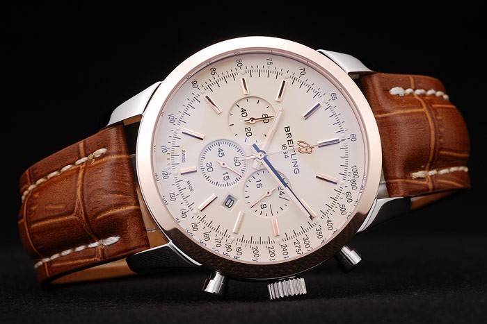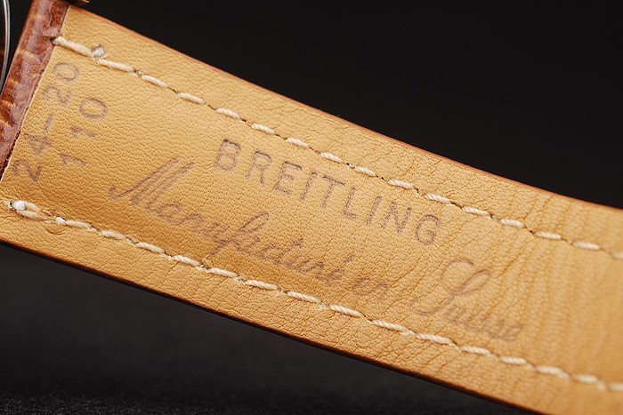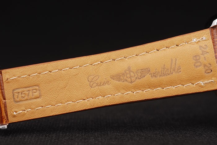 Bracelet: Heat embossed Breitling brown crocodile leather strap with white thread stitching and a Breitling logo engraved fold-in stainless clasp