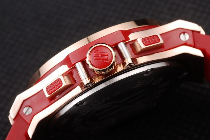 Crown: Cutwork rose-gold crown with ‘H’ engraving and two rectangular push-button crowns on either side , all studded with red rubber trimmings