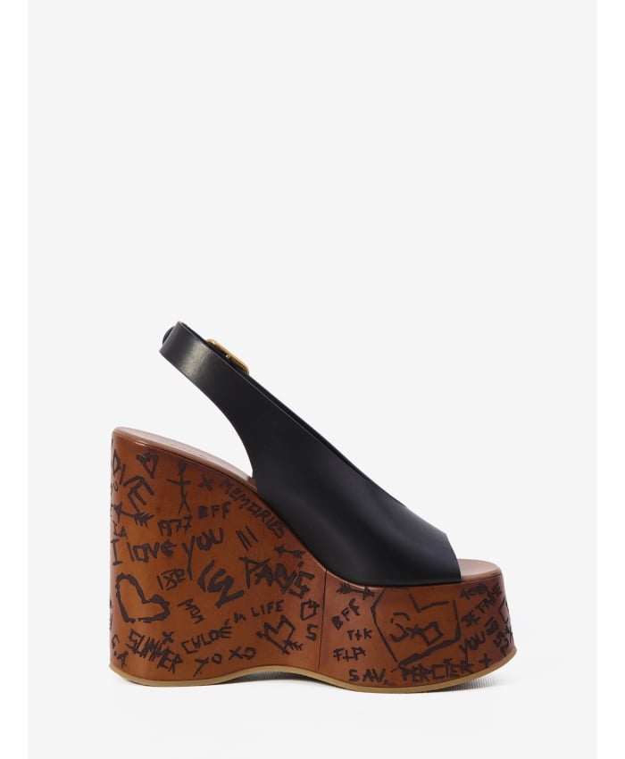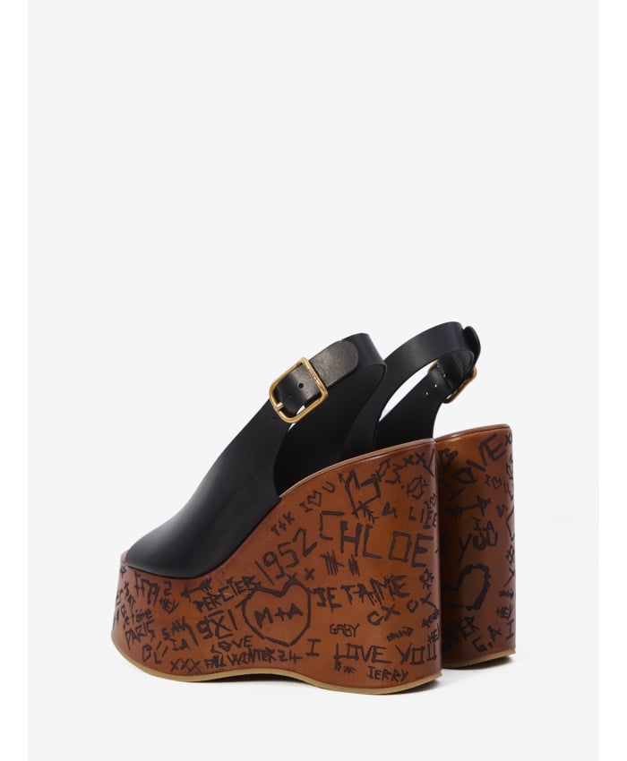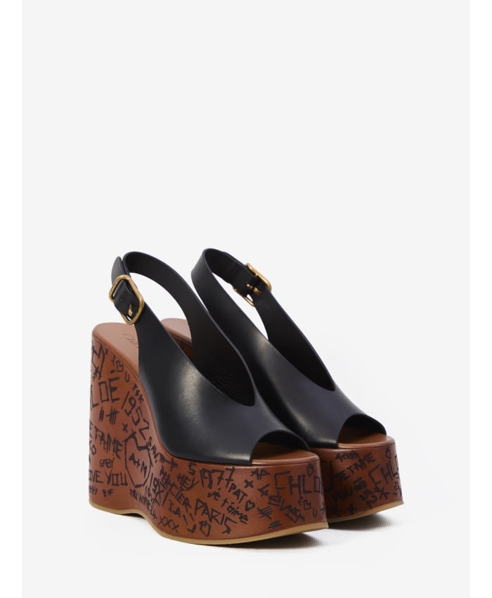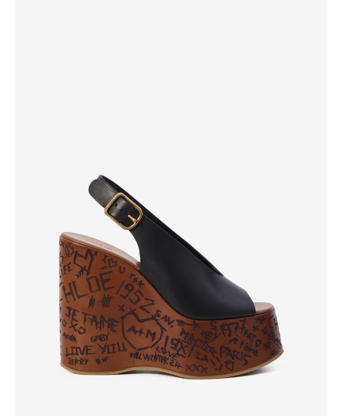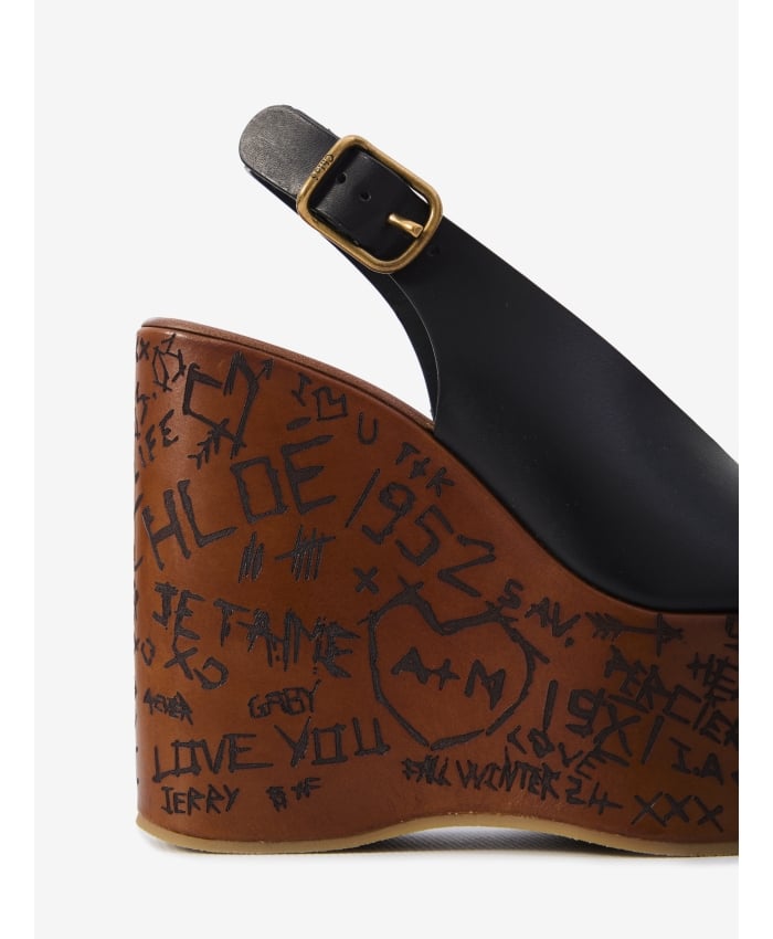 Maxime wedge sandals in semi-glossy black leather. They feature an open-toe upper, an adjustable ankle strap with an engraved Chloé buckle, a wood-effect platform with engravings, an engraved logo on the insole, and a vegetable-tanned leather sole. The wedge may show minor marks due to the delicate nature of vegetable-tanned leather; superficial imperfections should disappear by gently rubbing with your hands. Dust bag included. Any imperfections in the leather are not considered manufacturing defects but rather a characteristic of the material.ITA sizeWedge heel height: 13cm