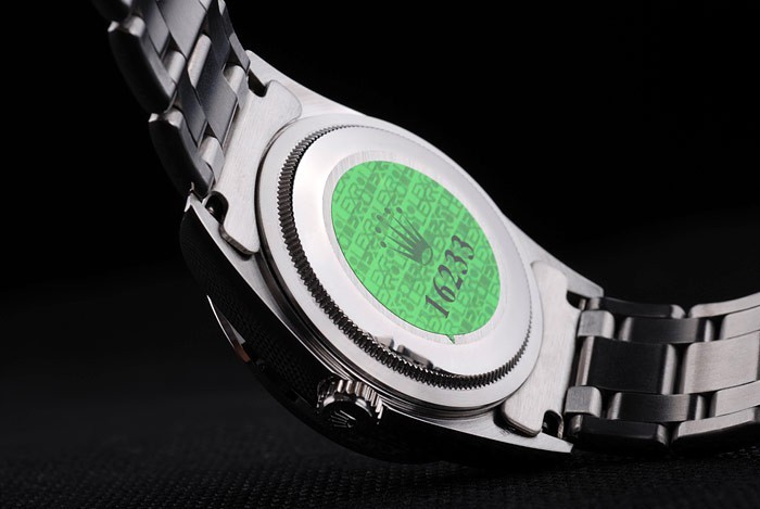 Back: Stainless steel push-in case back with green Rolex logo stamp