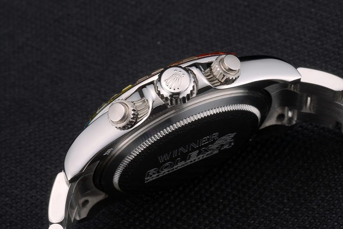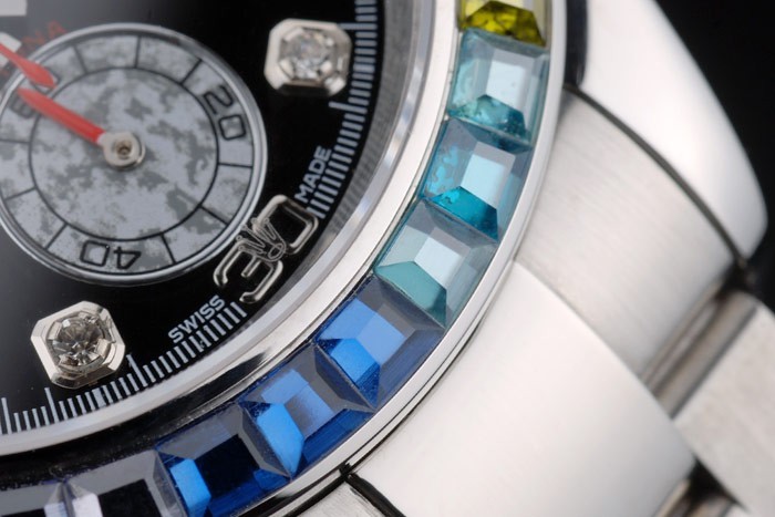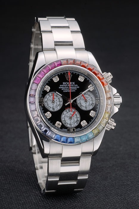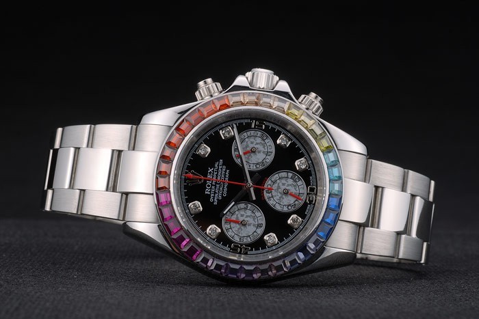 Rolex Daytona Cosmograph Rainbow Crystals Bezel Stainless Steep Strap Black Dial 80250