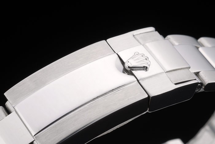 Crown: Polished stainless steel cutwork crown with Rolex logo and a push button crown on either side of it