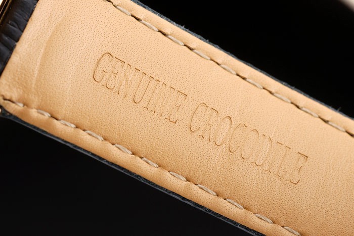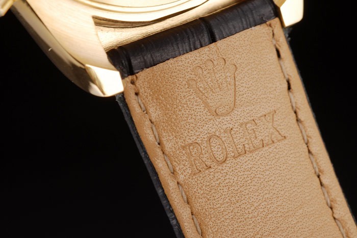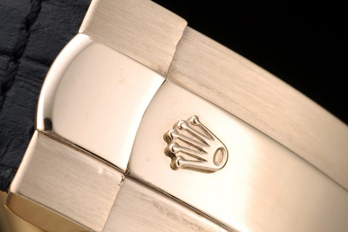 Bracelet: Rolex heat embossed black crocodile leather strap with engraved yellow gold deployment clasp with Rolex logo on top
