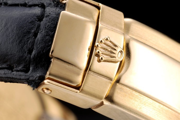 Crown: 18k yellow gold cutwork crown with Rolex logo and two smaller cutwork push button crowns on either side of it