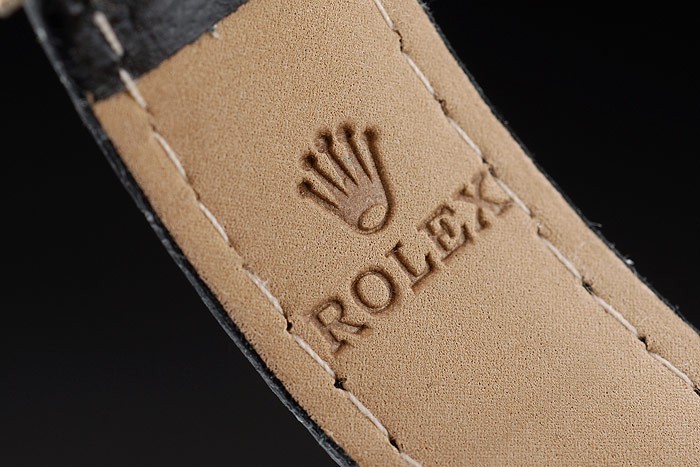 Bracelet: Rolex heat embossed black crocodile leather strap with engraved yellow gold deployment clasp with Rolex logo on top