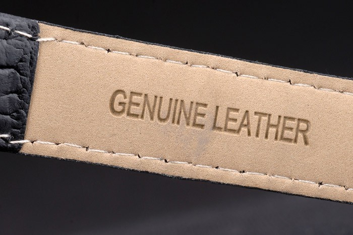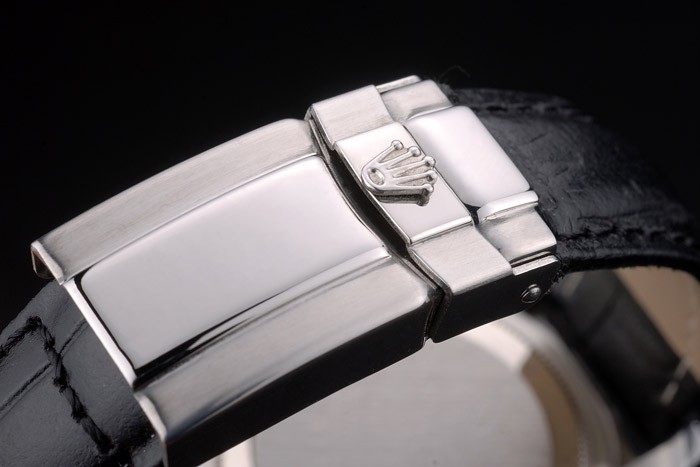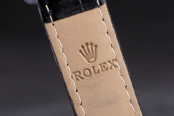 Bracelet: Rolex heat embossed black crocodile leather strap with engraved stainless steel deployment clasp with Rolex logo on top