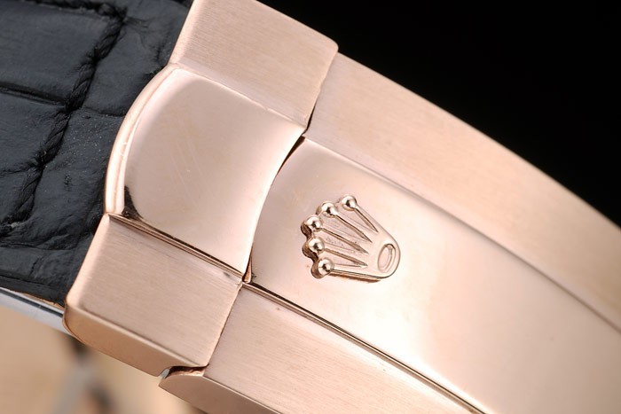 Bracelet: Rolex heat embossed black crocodile leather strap with engraved rose-gold deployment clasp with Rolex logo on top
