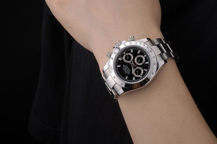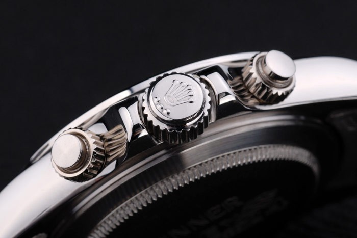 Crown: Polished stainless steel cutwork crown with Rolex logo and two additional crowns on either side of it