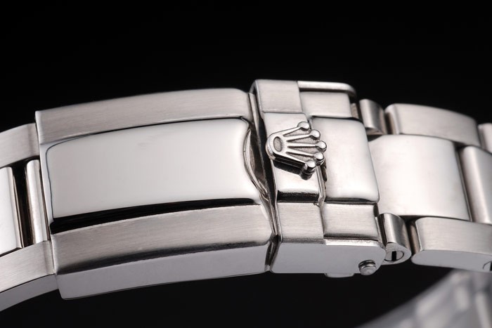 Bracelet: Brushed and polished stainless steel link bracelet with Rolex engraved deployment clasp displaying the Rolex logo