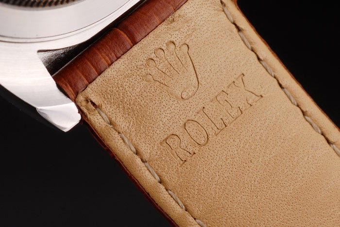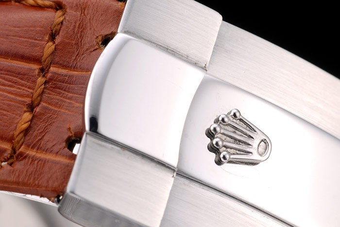 Bracelet: Rolex heat embossed brown crocodile leather strap with engraved stainless steel deployment clasp with Rolex logo on top