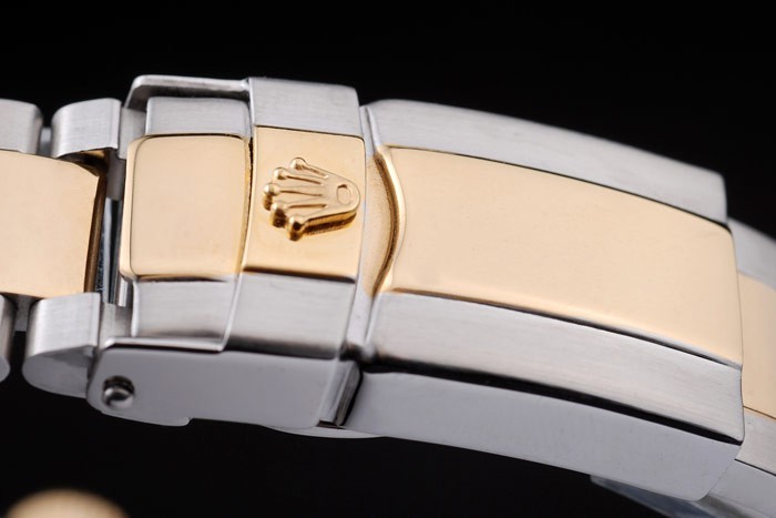 Bracelet: Brushed stainless steel and rose-gold link bracelet with Rolex engraving in the interior of the deployment clasp and a Rolex logo on top